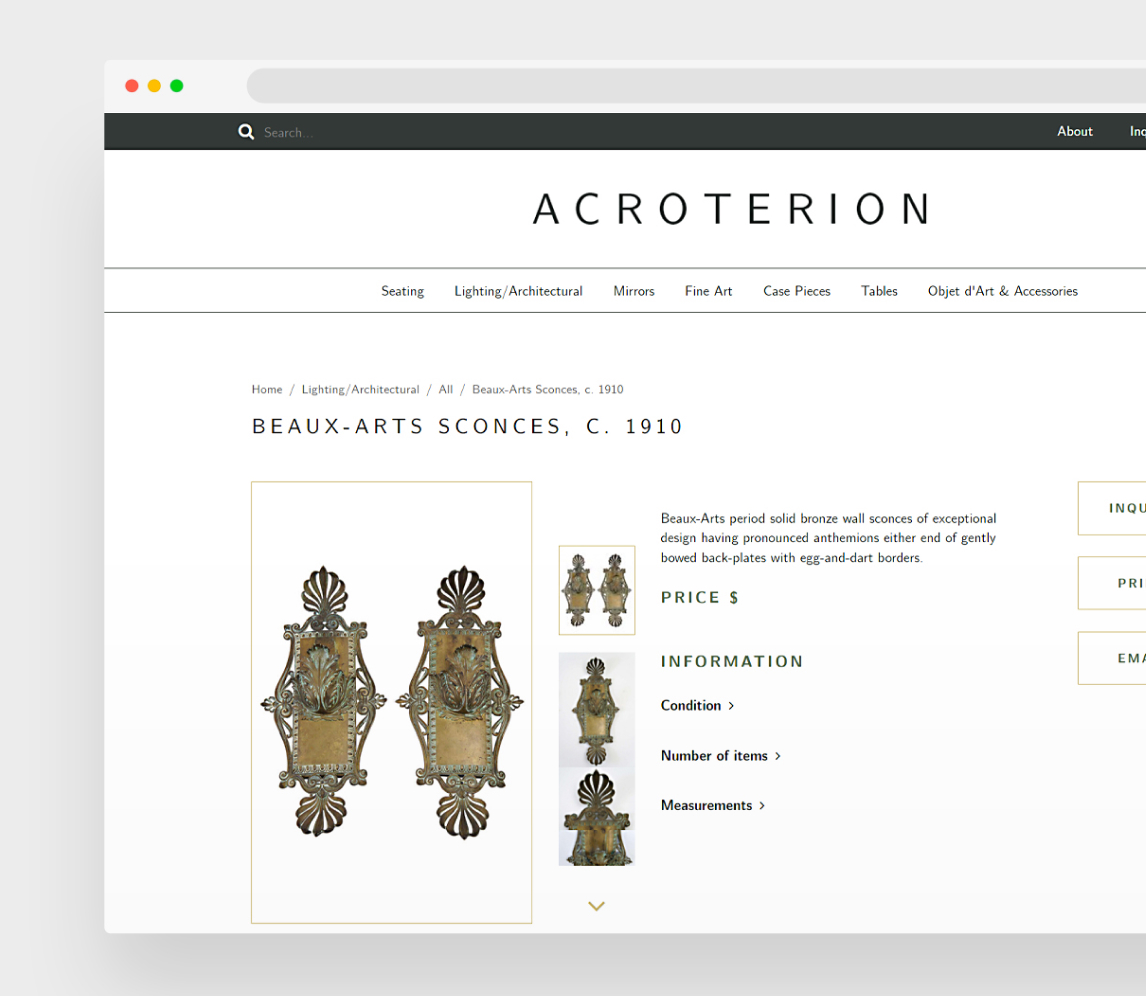 To design and develop a high-end, elegant and timeless ecommerce store showcasing Acroterion’s unique inventory of fine and decorative art with a focus on the uncommon. To align the aesthetic of the website with Acroterion’s brand expertly was of paramount importance in order to resonate with Acroterion’s elite and international customer base, composed of an esteemed audience of select interior designers, architects, private individuals, and foundations curating the world’s finest homes and collections.