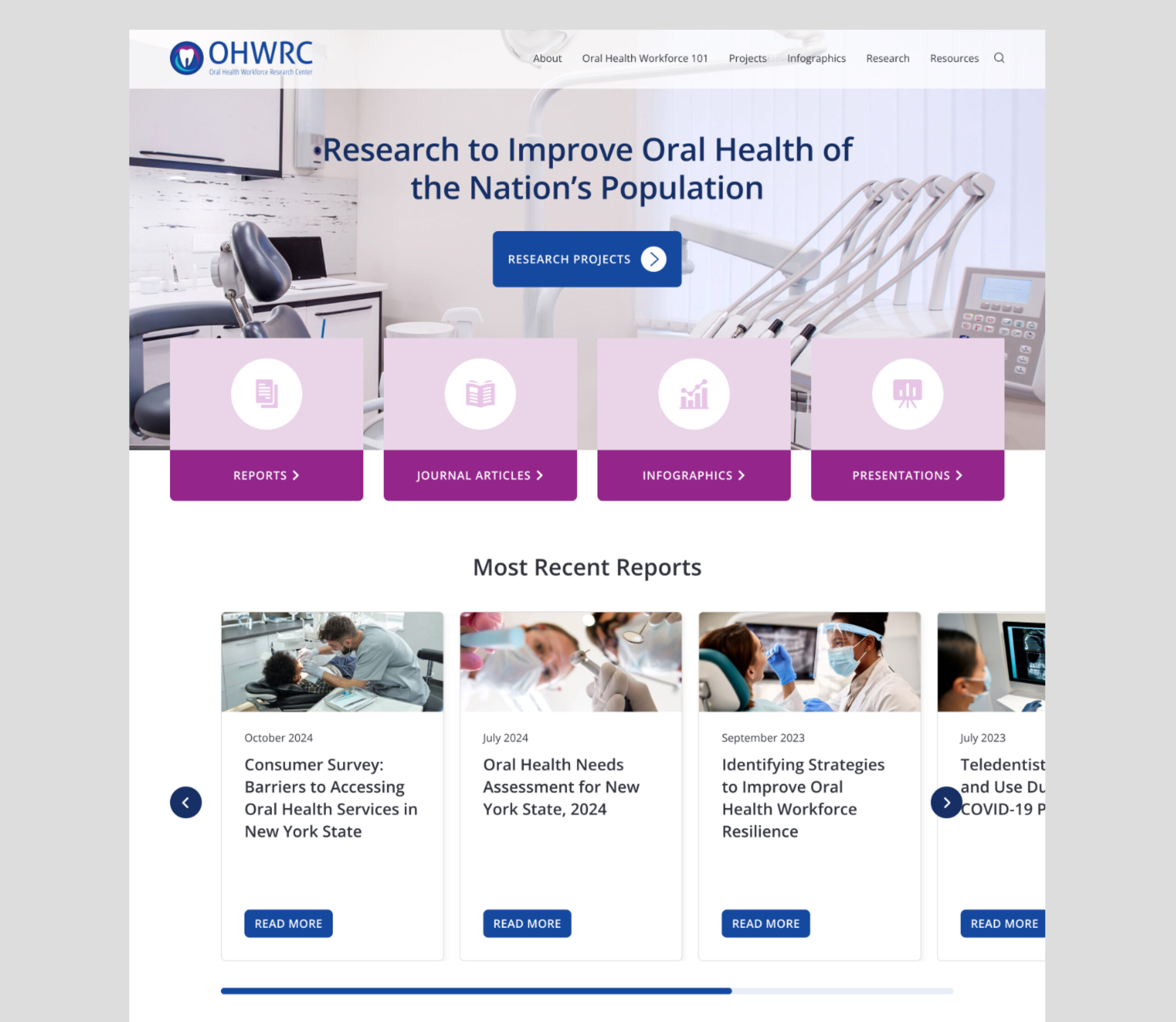 To design and develop a new website section that featured mixed media, NY Workforce Monitoring resources and search capabilities, and to create interactive infographics that illustrated multi-faceted oral health data criteria organized by state.