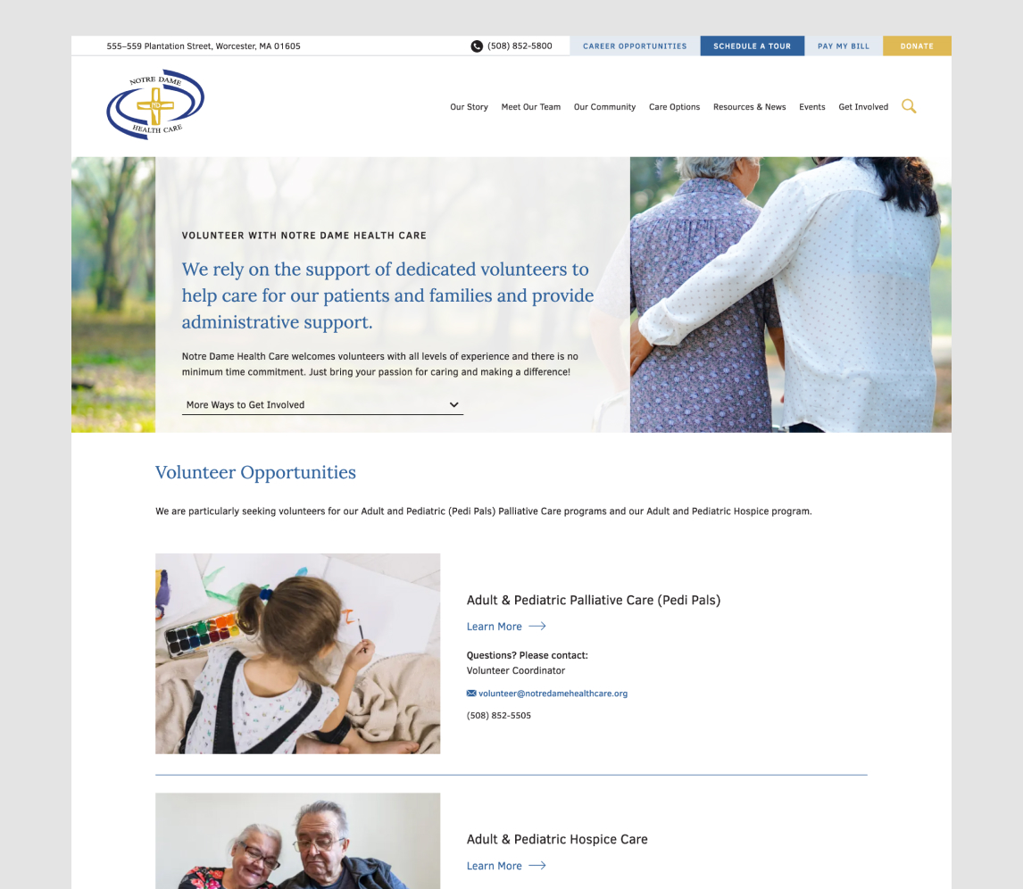 To increase new patient acquisition and retention, donations, student enrollment, job inquiries, volunteering, event attendance, newsletter subscriptions, and follows on social through a full website redesign that emphasized Notre Dame Health Care’s unique dedication to holistic care, advocacy for the vulnerable, life education services, and community leadership. NDHC also sought 3Lane’s assistance in developing a comprehensive Brand Book to accompany NDHC’s existing brand standards.